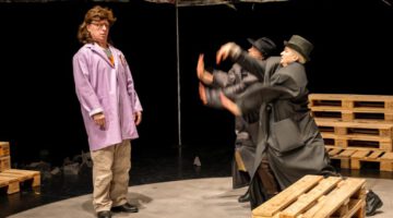 Es wird verfolgt, gejagt, gewachsen, es wird absurd geturnt, sich bewegt. Es wird maßlos übertrieben, und mitunter bis zur Unkenntlichkeit gesteigert. In der „verspielten“, spannenden Musik (Sebastian Maier), der Bewegung, der Stimmung. Eine dichte, sich rasant entwickelnde und magnetisierende Inszenierung mit ebenso rasant und effizienten, offenen Kostümwechsel und Umbauten. Das kleine Publikum wird sicht – und hörbar auf Trab gehalten, es scheint unentrinnbar ausgeliefert zu sein – dem „Augenblick des Moments“ und dieser spannenden Detektivgeschichte.