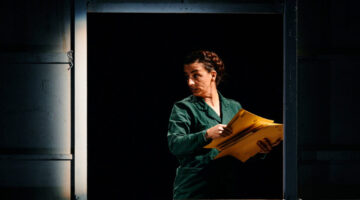 Lichtprojektionen durchbrechen die Dunkelheit auf der Bühne und verleihen der Szenerie um die Schauspieler:innen herum eine mystische Atmosphäre. Janine D‘Aragona steht auf einem großen Gerüst, während Peter Stephan Herff am Boden umhergeht – ein starkes Bild mit einem großen Gefälle, das gleich zu Anfang zeigt, worum es geht: Macht.